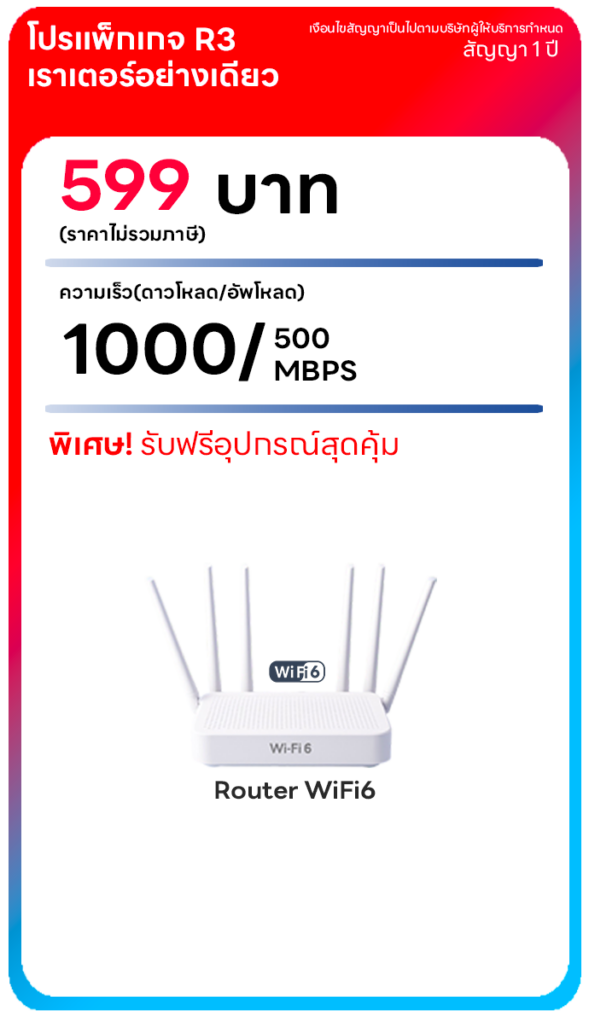 โปรโมชัน: ได้เราเตอร์ตัวท็อป WiFi 6 Pro และส่วนลดค่าแรกเข้า (นำมาลดค่าบริการรายเดือนได้ 100 บาท นาน 5-9 เดือน)